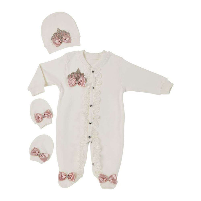 • 3 PC Set includes - Full body suit romper with Crystal motif , Cap with motif , mittens