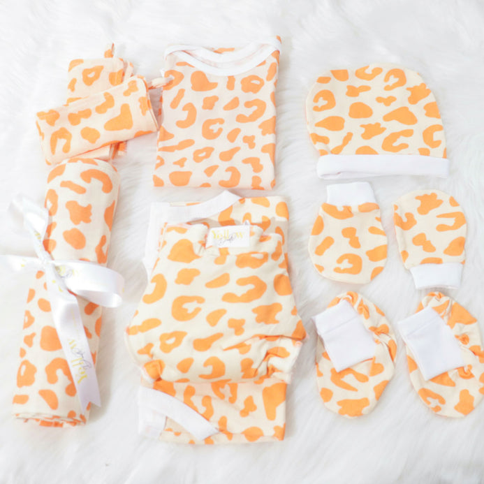 • Set of 11 : 1 Cotton Cap, 1 pair of mittens, 1 pair of booties, 1 babywear set (nappy & vest), 1 bodysuit, 1 luxury swaddle, 2 muslin wipes.