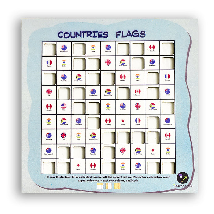 How to Play: Sudoku is played on a grid of 9 x 9 spaces. Within the rows and columns are 9 “squares” . Each row, column and square (9 spaces each) needs to be filled out with the countries flag, without repeating any flags within the row, column or square.