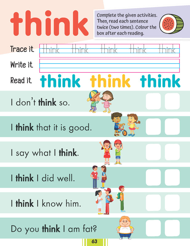 Fluency words are those necessary words that are commonly used in the English language. ‘Fluency Sentences’ is a book aiming to teach kids to learn to read, write and then put the fluently used words into simple sentences. This book will serve as a great reading foundation for children. • Ideal for ages 4-7 years • Pages 64 • Colourful presentation • Educative and entertaining • Building block for reading success • Lots of engaging activities • Strong foundation for literacy • Cute cover design This educative and entertaining book will help kids improve their vocabulary, language skills and become efficient readers. It will make kids trace, write, and read each word, then use it in a sentence to help them enhance their language skills. It will help children strengthen their spelling skills while developing their recognising common words skills by accurately using them in sentences.