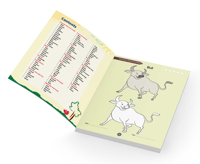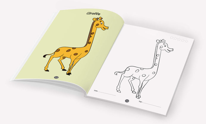 Colouring activities based on Early Years themes with big size thick outline pictures for free movement of small hands and coloured sample pictures for kids to copy and colour. Develops not just motor skills but also visual skills .