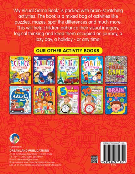 Packed with brain-scratching activities ‘My Visual Game Book’ is a bag of puzzles, mazes, spot the differences, and more. This book will help children enhance their visual imagery, logical thinking, and keep them occupied on a journey, a lazy day, a holiday, or any time! • 64 pages • Fun-filled activities • Perfect for 9-15 years • Colourful presentation • Child-friendly text This book will help kids learn while having fun. Solving these activities is a great way for sharpening observation skills. It will promote attention; get kids to improve their concentration and fine motor skills.
