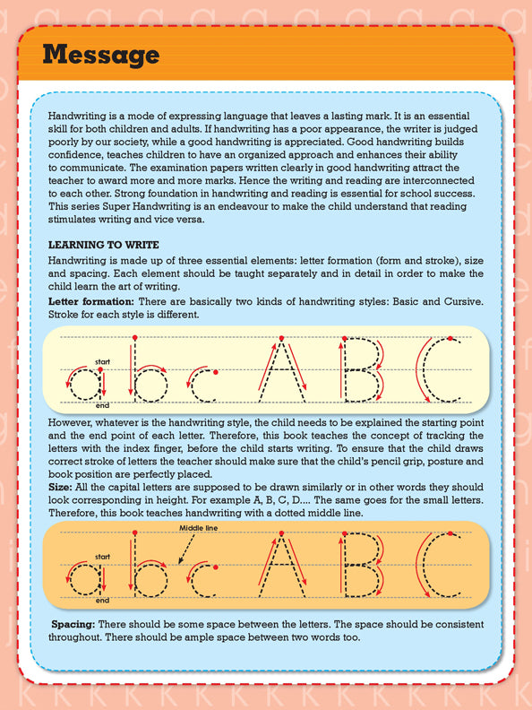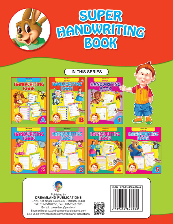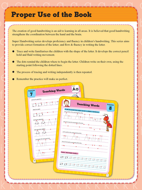 Great educational complement for primary school children ‘Super Handwriting Book’ is a fun and innovative resource to teach kids writing each letter of the alphabet, combining letters to make words, and forming sentences with easy-to-follow directions. This is the perfect starting book to give beginner learners a head-start with 60+ pages of tracing practice. • Ideal for age-group 3-5 • 64 pages • Cute cover design • Colourful presentation Organised in a progressive skill-building way this amazing handwriting practice book will help children develop their confidence to write neatly and improve their hand-eye coordination and motor skills.