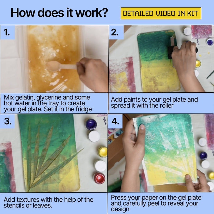 Unleash your creativity with our DIY Gel Plate Mono Printing Kit! This kit is perfect for anyone looking to explore the captivating world of gel plate printing, whether you're a beginner or an experienced artist. It comes with everything you need to create stunning, one-of-a-kind prints using this historic art form with a modern twist.