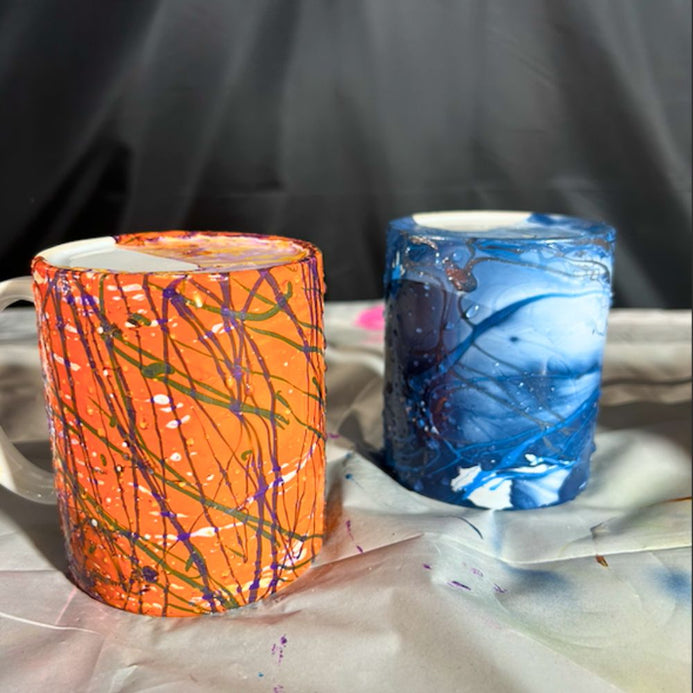 Marbling is a technique of aqueous surface design that produces patterns resembling smooth marble or stone. Colors float on water or a thick solution, and these patterns are carefully transferred onto a surface, like a mug. This centuries-old technique creates unique, unrepeatable designs, making each piece truly one-of-a-kind.