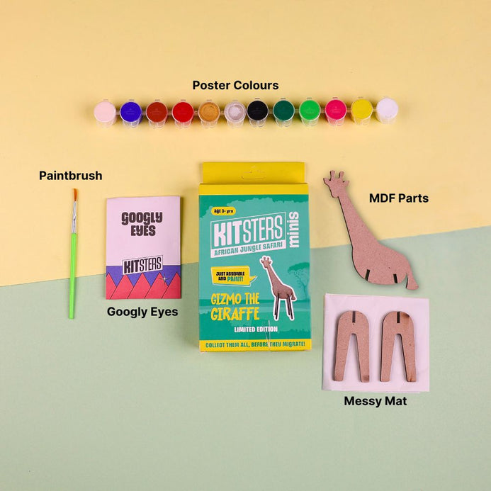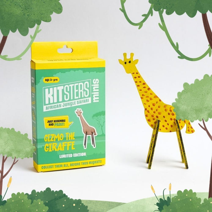 Meet Gizmo the Giraffe – your gateway to a mini African adventure! This delightful DIY kit allows kids to paint, assemble, and bring Gizmo to life. Perfect for little explorers, this kit offers hours of creative fun and transforms into a cherished companion for imaginative play. Ideal for displaying or taking on the go, Gizmo adds a touch of whimsy to any room or travel journey.