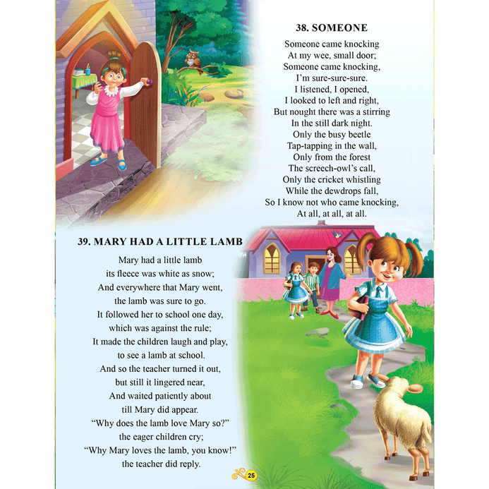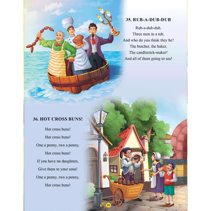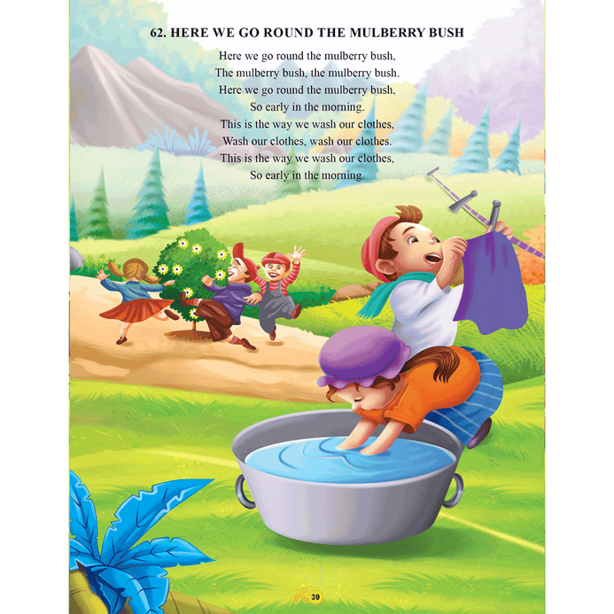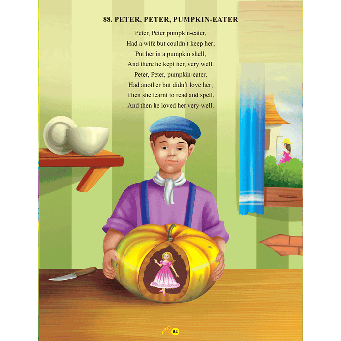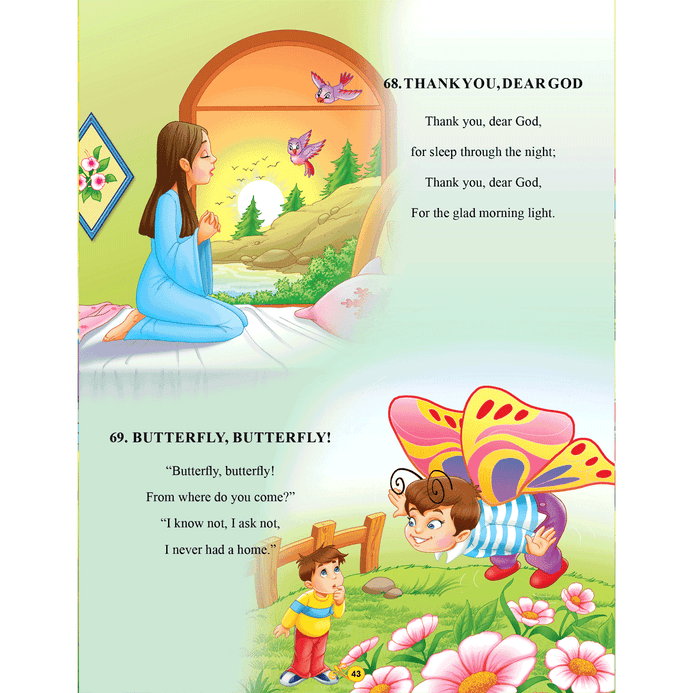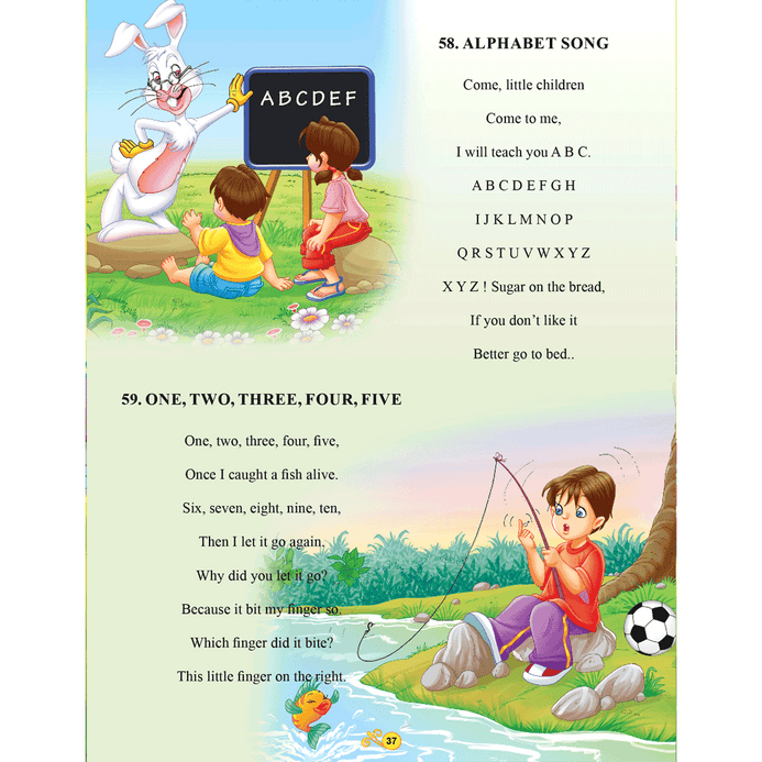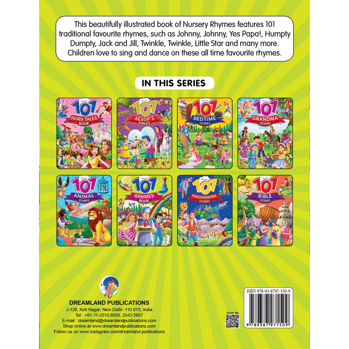 Nursery Rhymes are simple traditional songs or poems for children. ‘101 Rhymes Book’ is a wonderful pictorial book introducing children to their all-time favourite rhymes that include Johnny, Johnny, Yes Papa! Humpty Dumpty, Jack and Jill, Twinkle, Twinkle, Little Star and many more. • Adorable colourful presentation • 64 delightful pages • A nice gift for little learners ages 7-12 years • Enhances creativity • Stimulates imagination • Soothing colourful cover These melodic small rhymes develop phonemic awareness, teach children to pronounce words, build their early vocabulary, and creative skills. This book will help children start their reading journey and enjoy hours of singing and dancing with their friends, teachers, and parents.