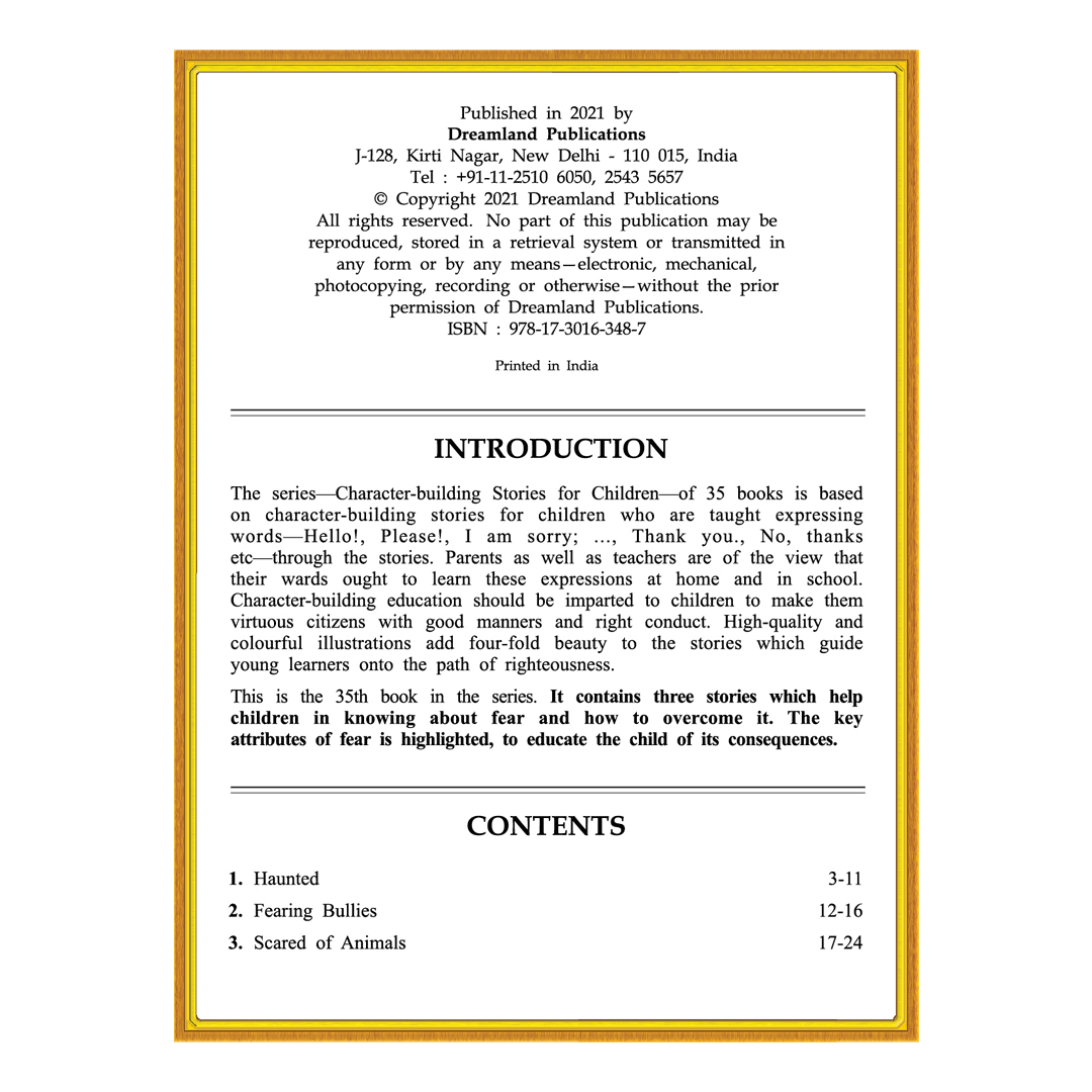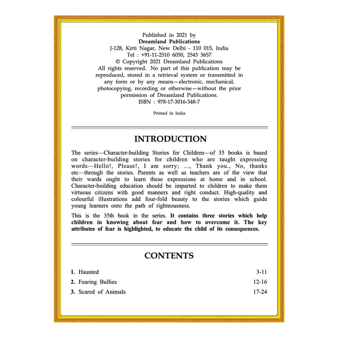 Character education is an integral part of education. ‘Character Building – Afraid’ this book contains three stories that help children in knowing about fear and how to overcome it. The key attributes of fear are highlighted to educate the child of its consequences. These stories make it easy to teach moral values in a meaningful way. • Ideal for ages 6-8 • 24 pages • Includes moral lessons • Colourful presentation • Nice cover design Designed and compiled keeping young kids in view lessons learnt through these interesting stories will definitely help children become confident citizens. Nice illustrations add beauty to each story that also guides young learners on the path of righteousness. It is an excellent resource for character-conscious kids.
