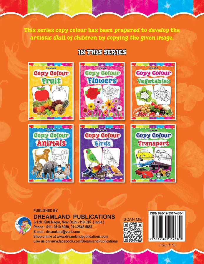 Colouring is a delightful exercise for the little bundles of energy. ‘Copy Colour Vegetables’, this cute colouring book has simple illustrations of lots of vegetables such as peas, tomato, corn, cauliflower, and many more for toddlers to fill colours in. It will also help little artists learn about the names of healthy veggies. • Suitable for 1-6 years • 16 big pictures of vegetables • Each page includes the name of the vegetable • Attractive cover design • Develops colour recognition Designed to develop the artistic skills of children by copying the given illustration, this super-fun book is best for colouring pencils and crayons or sketch pens. Kids will spend a colourful time colouring their favourite fruit.