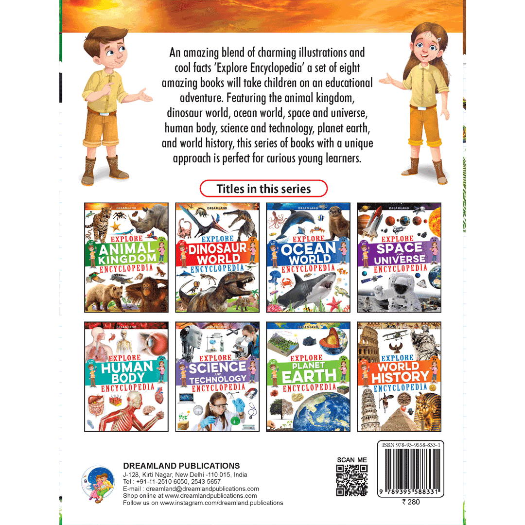 An Amazing blend of charming illustrations and cool facts, 'Explore Encyclopedia' a set of eight amazing books will take children on an educational adventure. Featuring the animal kingdom, dinosaurs, ocean world, space and universe, human body, science and technology, planet earth, and world history, this series of books with a unique approach is perfect for curious young learners.