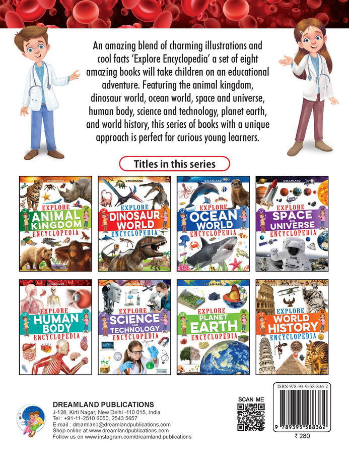 An Amazing blend of charming illustrations and cool facts, 'Explore Encyclopedia' a set of eight amazing books will take children on an educational adventure. Featuring the animal kingdom, dinosaurs, ocean world, space and universe, human body, science and technology, planet earth, and world history, this series of books with a unique approach is perfect for curious young learners.