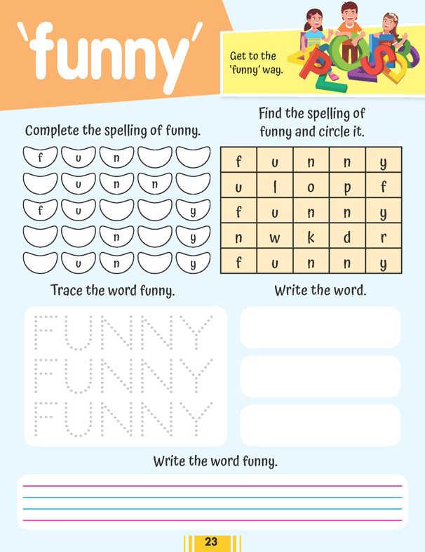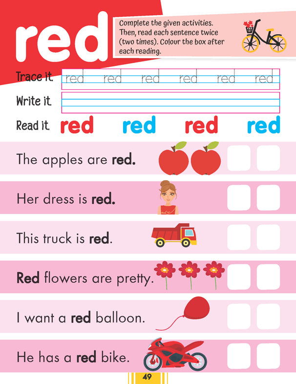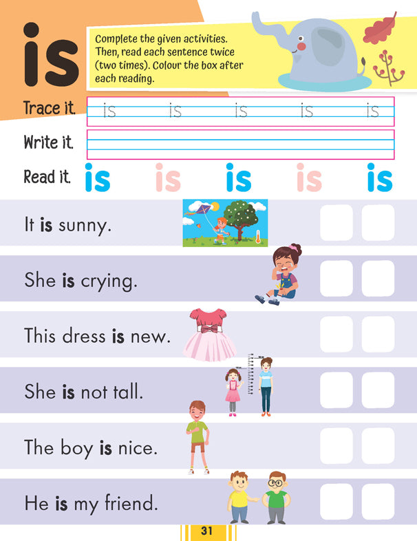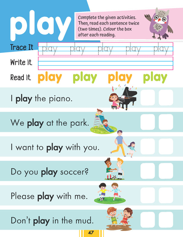 Fluency words are those necessary words that are commonly used in the English language. ‘Fluency Sentences’ is a book aiming to teach kids to learn to read, write and then put the fluently used words into simple sentences. This book will serve as a great reading foundation for children. • Ideal for ages 4-7 years • Pages 64 • Colourful presentation • Educative and entertaining • Building block for reading success • Lots of engaging activities • Strong foundation for literacy • Cute cover design This educative and entertaining book will help kids improve their vocabulary, language skills and become efficient readers. It will make kids trace, write, and read each word, then use it in a sentence to help them enhance their language skills. It will help children strengthen their spelling skills while developing their recognising common words skills by accurately using them in sentences.