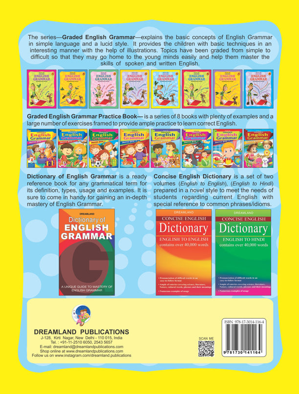 Compiled and designed in a uniquely graded manner ‘Graded English Grammar’ is meant for students of Grade 5 who have already learnt the basic concepts of English Grammar. ‘Graded English Grammar – Book 5 includes a recapitulation of earlier learnt lessons and others like Use of Dictionary, Possessive, Interrogative and Demonstrative Determiners, Adverbs, Prepositions, and many more. • Ideal for age-group 6-8 • 112 pages • Cute cover design • Colourful presentation The use of colourful illustrations helps children grasp basic facts of English Grammar. Supporting children’s basic understanding of English Grammar, this book included the explanation of the rules of grammar taught in each lesson to make the teaching-learning process much easier and more effective. Exercises given at the end of each lesson will allow kids to check their progress.