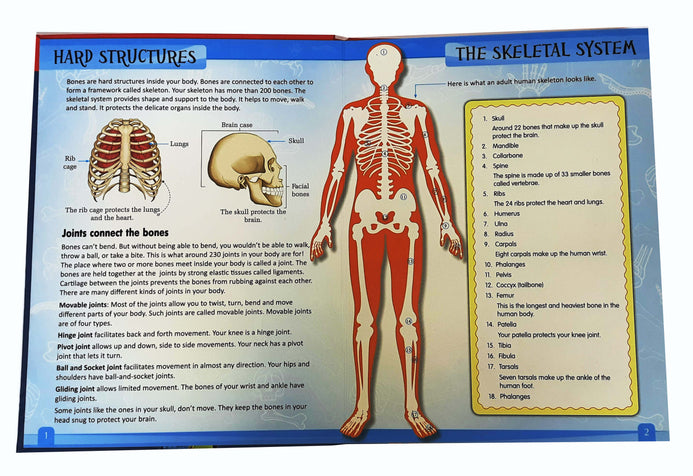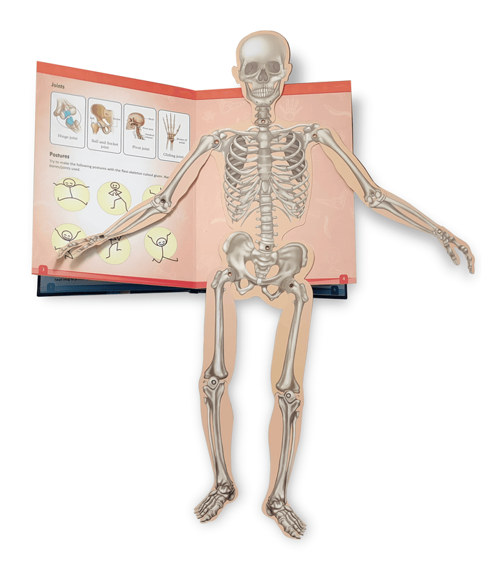 A knowledge book with a life size human sketeton. It includes facts related to human body, its working and how it helps us. The human skeleton parts can be folded in and out to see how our bones and joints work.