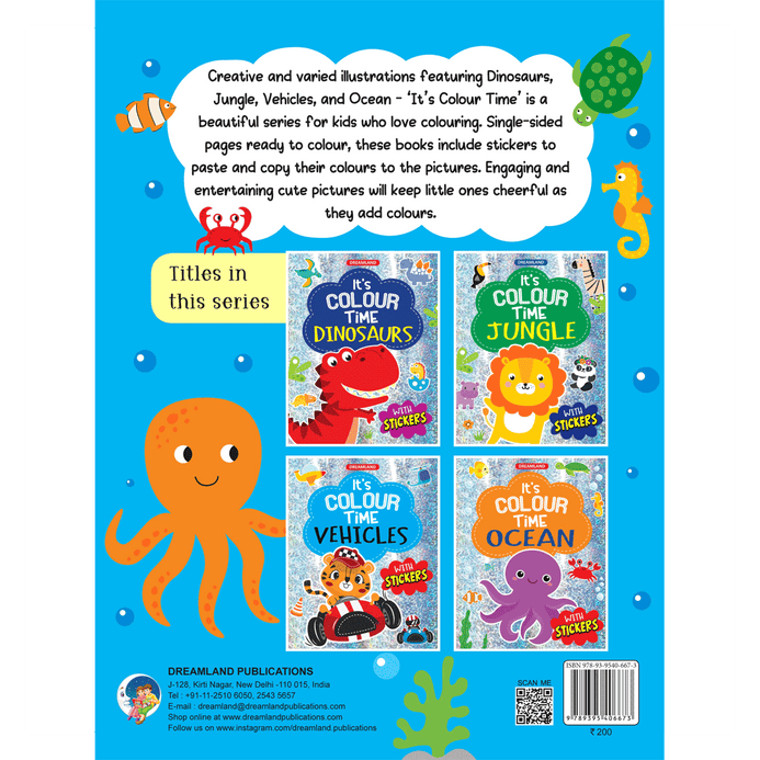 Creative and varied illustrations featuring Dinosaurs, Jungle, Vehicles and Ocean- ‘It’s Colour Time’ is a beautiful series for kids who love colouring. Single-sided pages ready to colour, these books include stickers to paste and copy their colours to the pictures. Engaging and entertaining cute pictures will keep little ones cheerful as they add colours.