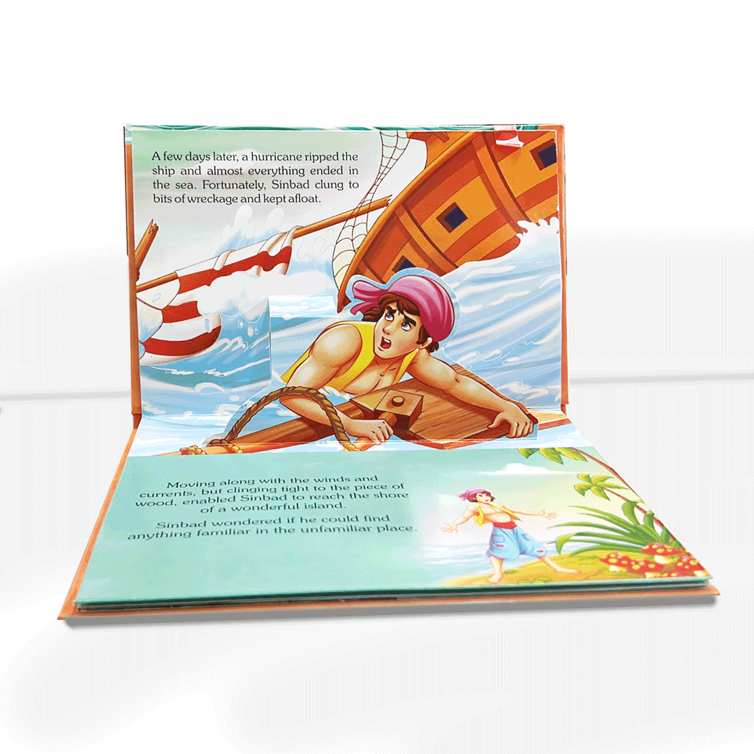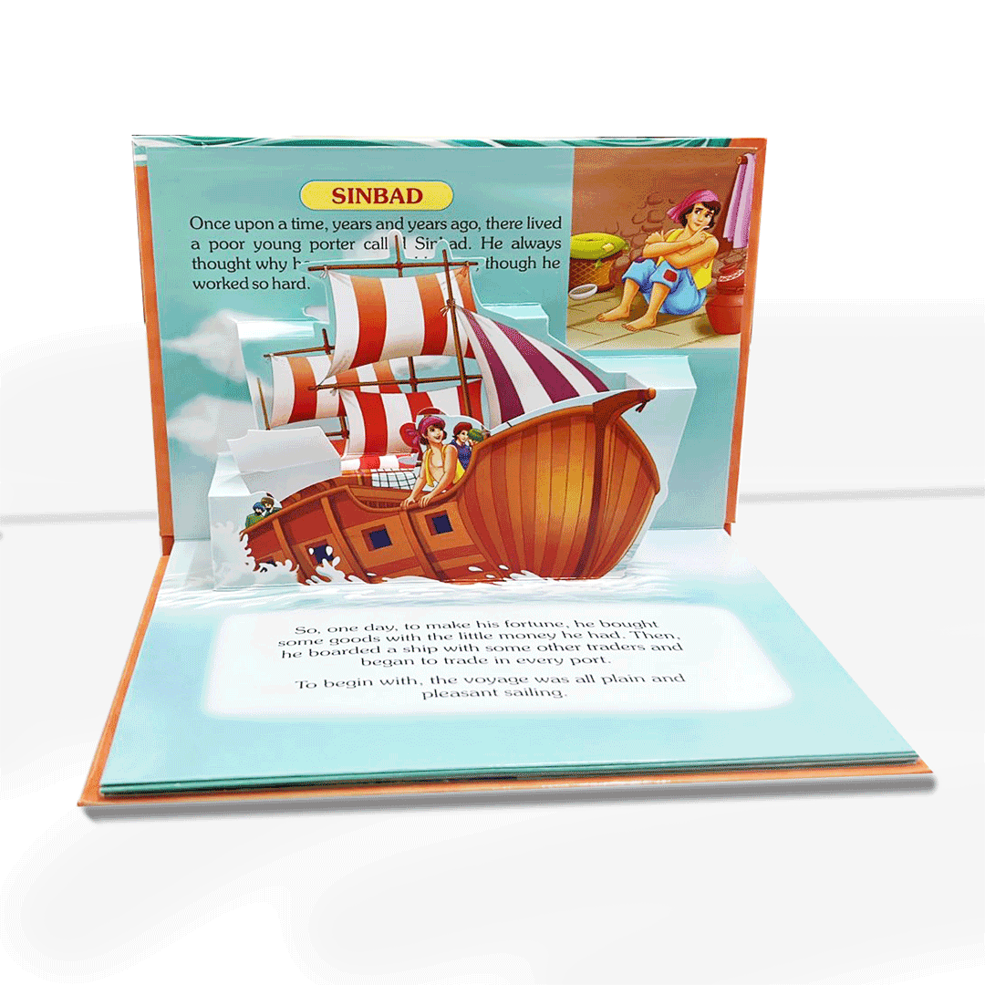A story of a sailor who is able to survive the terrible dangers he encounters and returns home with a fortune. ‘Pop-up Fairy Tales – Sinbad’ this richly illustrated story, retold in easy language is sure to become a favourite of young readers. • Ideal for ages 3-7 • 12 pages • Amazing artwork • Colourful presentation Filled with humour and adventure it will enchant young readers and listeners. The pop-ups that jump from the pages will delight any story-lover fan.