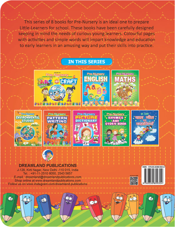 Good writing books are essential for early learners to help them develop their motor skills, improve their hand-to-eye coordination and help them get good handwriting as they grow up. Pre-Nursery Pattern Writing book has been designed for preschoolers to introduce them to simple strokes, curves, and patterns. • Ideal for ages 2-5 • Over 50 practice pages on different patterns, tracing lines, curves, and shapes • Colourful presentation • Age-appropriate activities with cute images This wonderful book is a useful book for preschoolers who have just learned to hold writing tools. Introducing pre-writing patterns in a fun, enticing, and active way, this book comes perfectly with activities to develop early writing skills and boost artistry in a fun and easy way.?