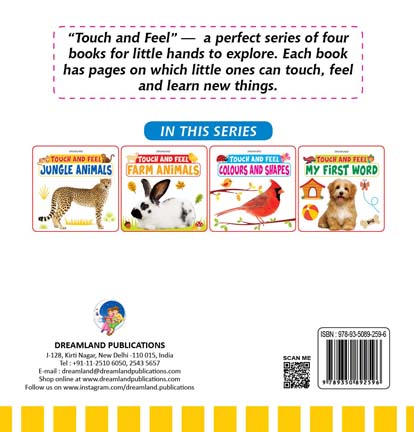 This ‘Touch and Feel – Colours and Shapes’ book will delight tiny tots with its colourful pictures. With the exciting texture to touch, vibrant images, and simple word labels, this book will help to stimulate babies’ senses and encourage them to recognise various objects. • 12 pages • Ideal for age-group 1-3 years • Ideal for developing early learning skills • Interesting text matter • Touch and feel material to stimulate the senses • Richly illustrated • Ideal size for little hands • Durable and high quality • Soft and sparkling cover design Little ones can touch and feel material on every alternative page. Supporting text about each colour and shape is a great way to introduce children to primary colours and shapes.