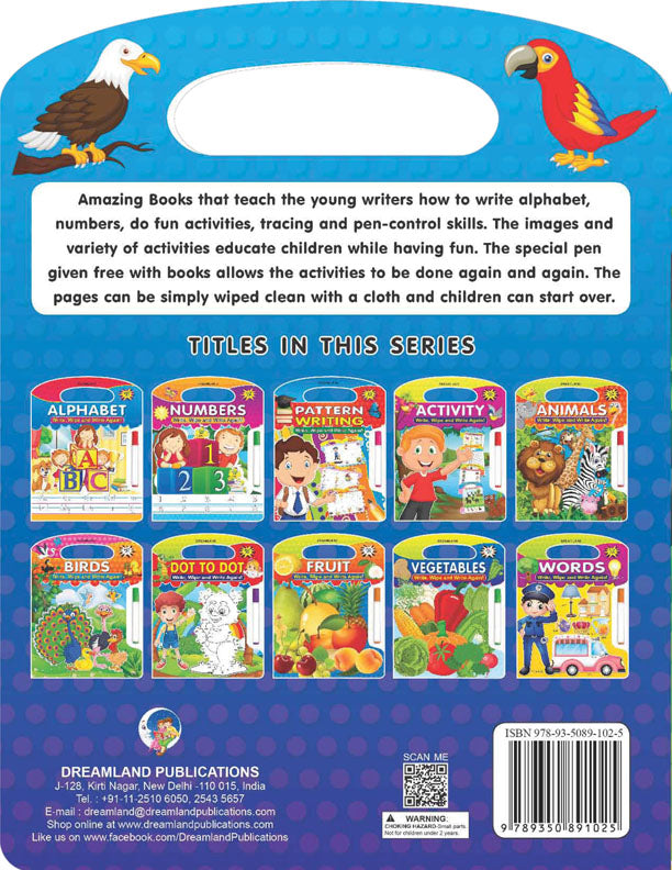 Wipe clean educational books encourage repetition for increased learning. Featuring 16 pages of interesting activities, ‘Write and Wipe and Write Again – Birds’ this book will make early learning fun for preschool-age children. The colourful images of the book make learning interesting. • Ideal for age-group 2-4 • 16 wipe-clean pages • Colourful presentation • Cute cover design • Marker pen • Encourages independent learning It is an ideal book for little ones to enable them to practice over and over to improve their pen control and writing skills. The pages can be simply wiped clean with a cloth and children can start over. It is the best tool to boost the confidence of tiny tots.