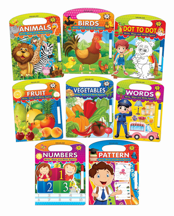 Practice makes everyone perfect. Featuring 16 pages each, ‘Write and Wipe and Write Again’ this pack of eight books includes titles – Animals, Birds, Dot-to-Dot, Fruit, Vegetables, Words, Numbers, and Pattern. It will make early learning fun for preschool-age children. The colourful images of these books will make learning interesting. • Ideal for age-group 2-4 • Eight books of 16 wipe-clean pages each • Colourful presentation • Cute cover design • Marker pen • Encourages independent learning It is an ideal pack for little ones to enable them to practice over and over to improve their pen control and writing skills. The pages can be simply wiped clean with a cloth and children can start over. It is the best tool to boost the confidence of tiny tots.