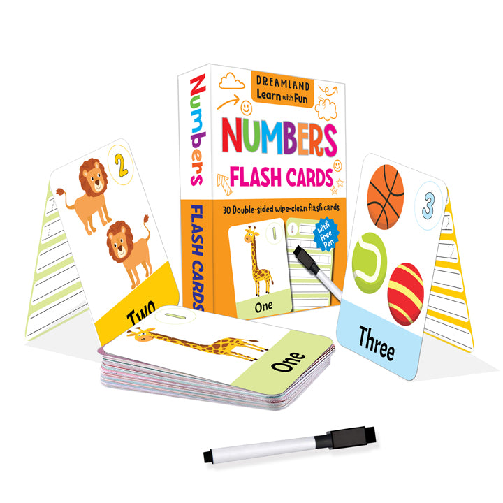 Dreamland Flash Cards Numbers - 30 Double Sided Wipe Clean Flash Cards for Kids (With Free Pen)