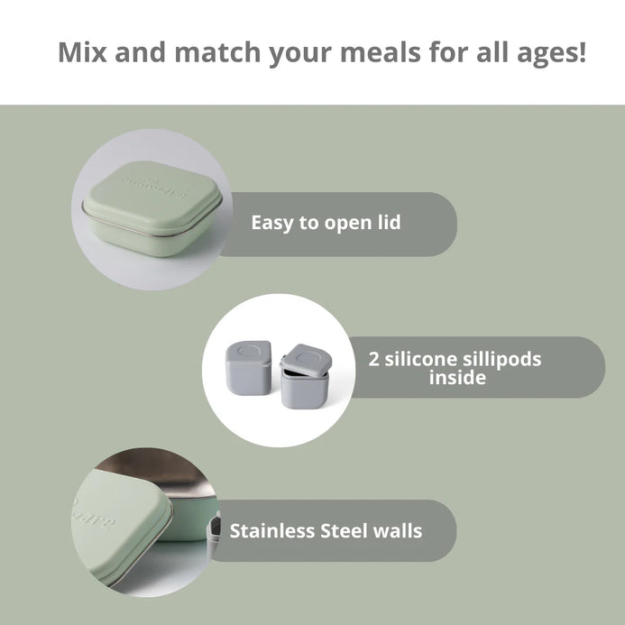 Miniware Grow Bento Lunch Box Set offers storage for a wide range of food combinations, including liquids like hot soup and dressings. The ultra-durable materials are long-lasting and will grow with your baby's needs, from pureed foods to school lunch. Stainless Bento can hold pastas, sandwiches, salads, and so much more... Perfect for any child's lunch! Use 4 Silipods for baby purees, or use the Bento to carry a salad and add in one Silipod for dressing. The possibilities are endless!