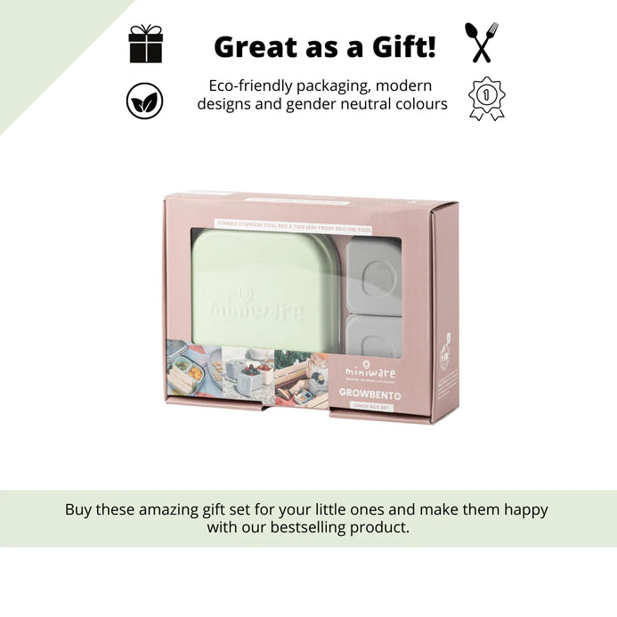 • Miniware Grow Bento Lunch Box Set offers storage for a wide range of food combinations, including liquids like hot soup and dressings. The ultra-durable materials are long-lasting and will grow with your baby’s needs, from pureed foods to school lunch. Stainless Bento can hold pastas, sandwiches, salads, and so much more... Perfect for any child’s lunch! Use 4 Silipods for baby purees, or use the Bento to carry a salad and add in one Silipod for dressing. The possibilities are endless!