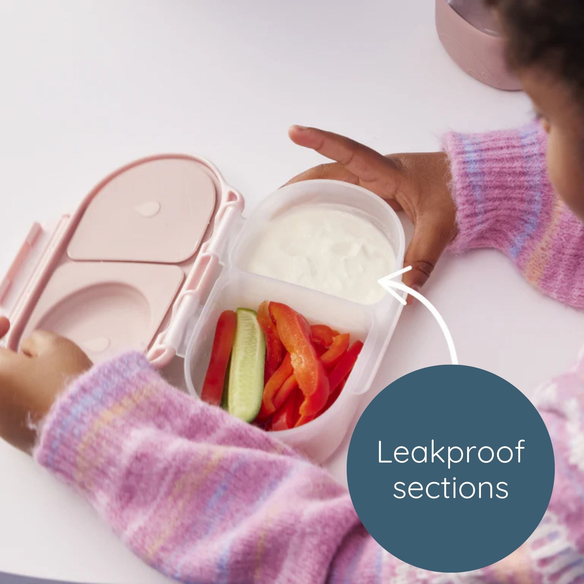• 2 sealed compartments are leak proof securing wet foods such as puree, yoghurt and dips