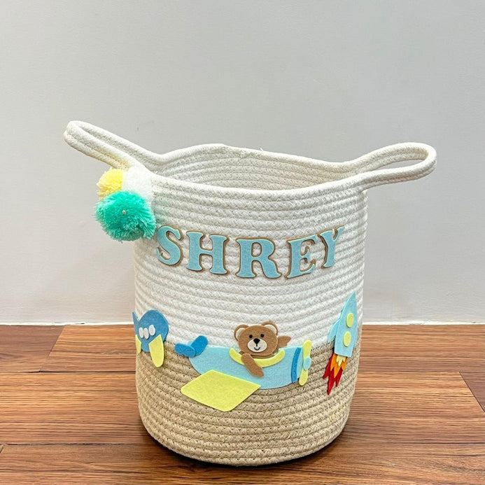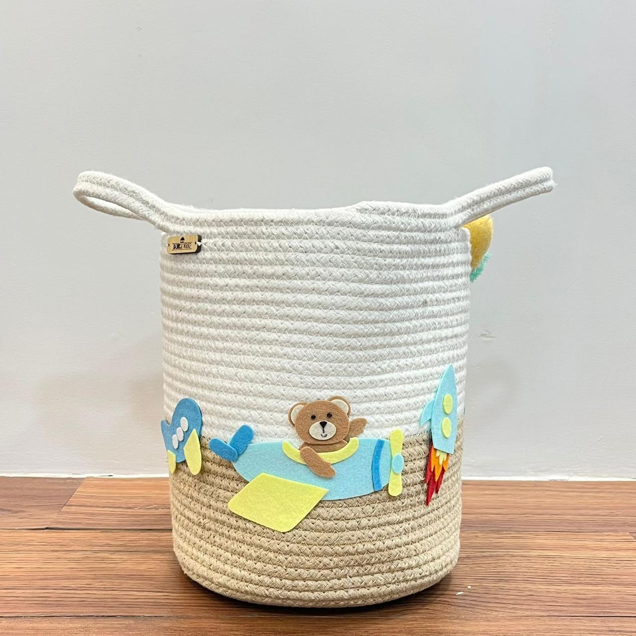 Our Basket crafted from durable jute and soft cotton, it offers both sturdiness and comfort. Perfect for carrying books, toys, or treasures from a galactic journey, this basket is as functional as it is enchanting. Elevate your child's storage with a sprinkle of cosmic magic and practicality, and let their imagination soar among the stars. This space theme basket in bright hues serves as a dual purpose of both kid's room decor as well as storage made easy with two convenient sizes and comes embellished with planets, astronaut, rocket and Earth.