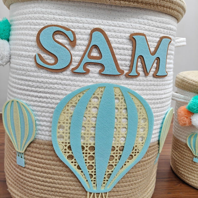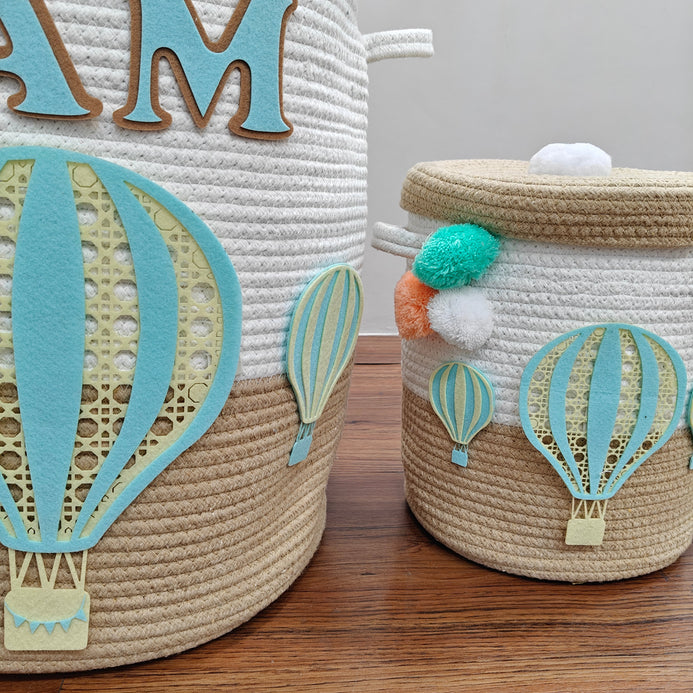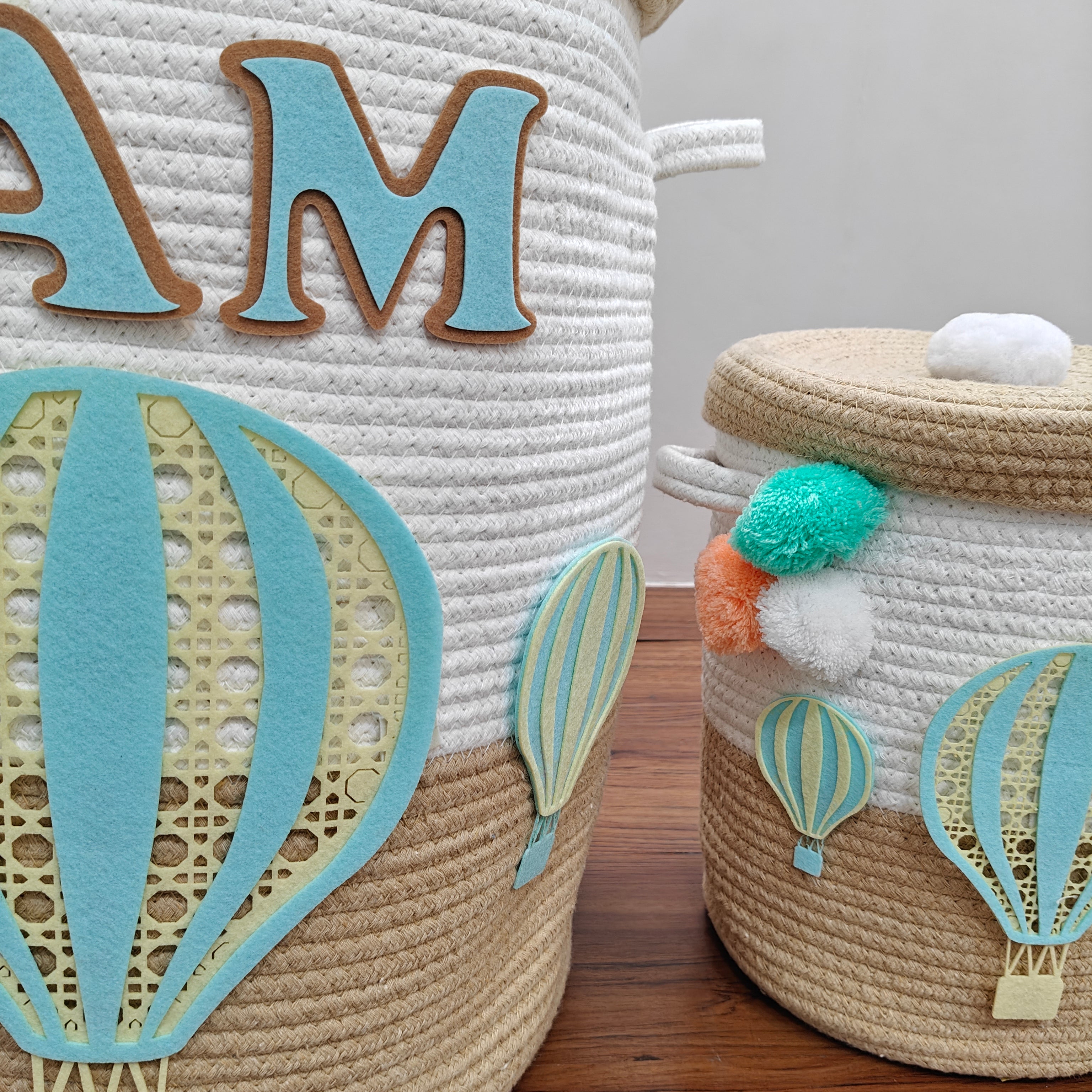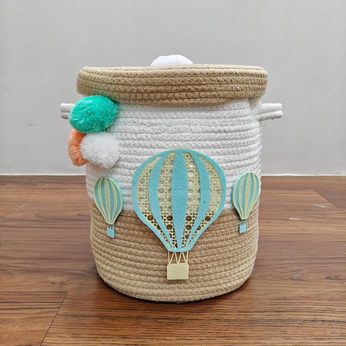 Our Basket crafted from durable jute and soft cotton, it offers both sturdiness and comfort. Perfect for carrying books, toys, or treasures, this basket is as functional as it is enchanting. Elevate your child's storage with a sprinkle of magic and practicality, and let their imagination soar among the stars. This Toffee Drift  theme basket in bright hues serves as a dual purpose of both kid's room decor as well as storage made easy with two convenient sizes and comes embellished with delightful designs of Hot balloon