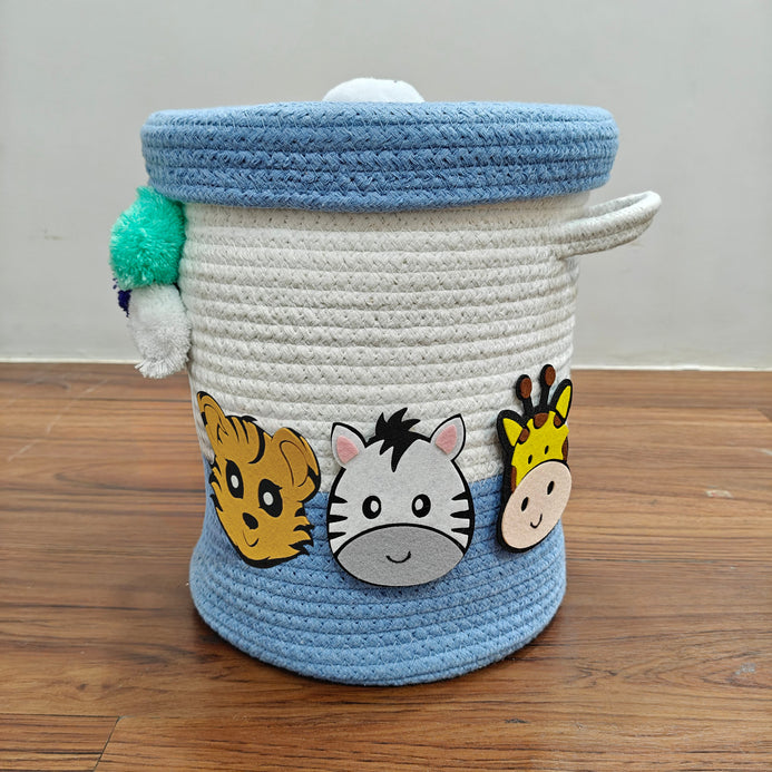 Our Basket crafted from durable jute and soft cotton, it offers both sturdiness and comfort. Perfect for carrying books, toys, or treasures, this basket is as functional as it is enchanting. Elevate your child's storage with a sprinkle of magic and practicality, and let their imagination soar among the stars. This Zooblu theme basket in bright hues serves as a dual purpose of both kid's room decor as well as storage made easy with two convenient sizes and comes embellished with delightful designs of Tiger , Zebra ,Giraffe .