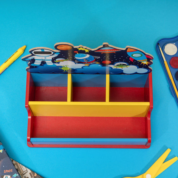 Keep your desk and work area organized and fun with this 3 Slot Stationery Holder! This organizer features a colourful back to school theme that is perfect for both kids and adults. With three compartments, it is ideal for storing pens, pencils, markers, and other small art supplies. Made of durable materials, this holder is built to last and will add a touch of magic to any studyspace. Whether you're looking for a gift for a student, teacher, or artist, this stationery holder is a practical and charming addition to any desk.