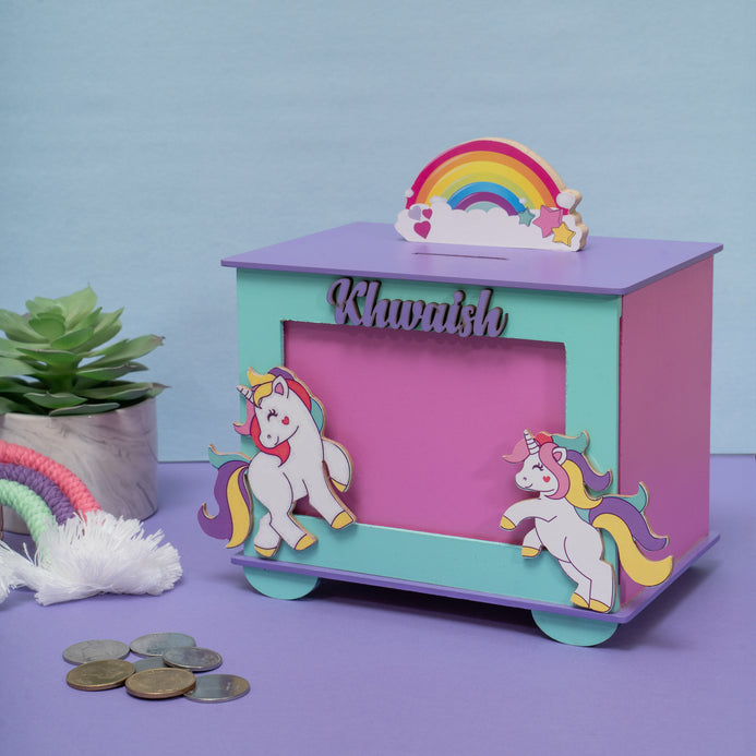 Our cute and handy piggy bank with a photo frame - the perfect gift for kids! This adorable piggy bank is creatively designed with colorful motifs that will surely capture the attention of any little one. Featuring a photo slot on one side, it allows children to display their favorite photo and save money at the same time. Made from durable materials, this piggy bank is a reliable tool for starting a savings habit that will last a lifetime. Get yours now and make savings fun and exciting!