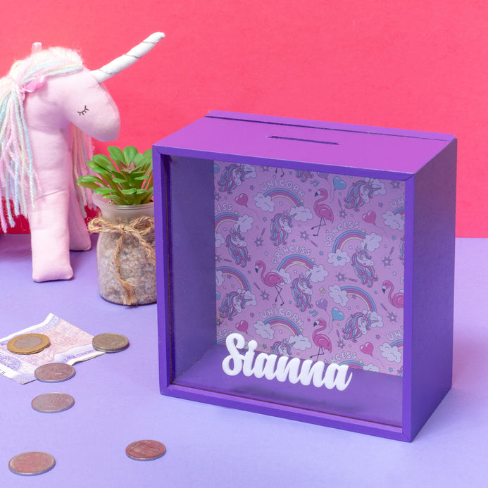Our adorable purple shadow box piggy bank for kids! is a quirky and fun way not only a great way to teach children the concept of saving money at an early age, but it also makes for a fantastic personalized gift. The shadow box design provides a unique and creative way for kids to watch their savings grow as the box fills up. With its bright blue color and customizable options, this piggy bank is guaranteed to be a hit with any child. Help your little ones develop valuable financial skills while adding a touch of whimsy to their room décor with this delightful shadow box piggy bank.