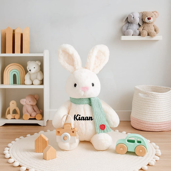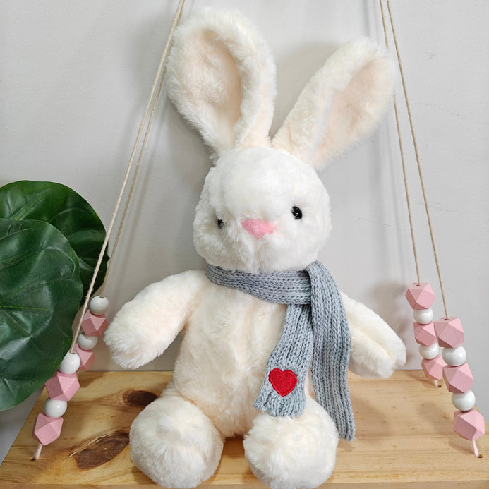 A soft plush companion with extra charm – this bunny comes dressed in a hand-knitted scarf and a whole lot of love. Made from premium velvety fabric and designed with floppy ears and a huggable body, it's the perfect blend of comfort and cuteness.
