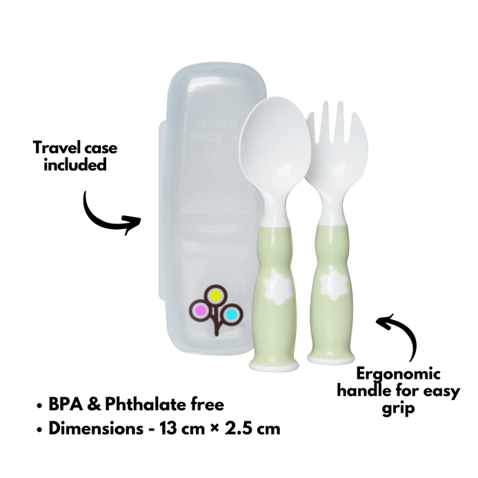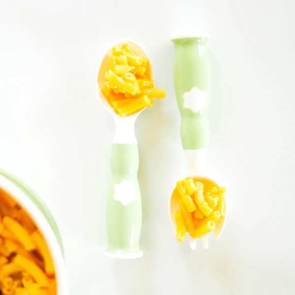 We can't promise that your child won't spill the beans. However, with easy-grip handles and a wide bowl to easily scoop up food, FORK & SPOON offers an easy way to feed your baby or let them learn to feed themselves. Includes a travel case that can fit easily into diaper bags and lunchboxes. Take it anywhere for your baby.