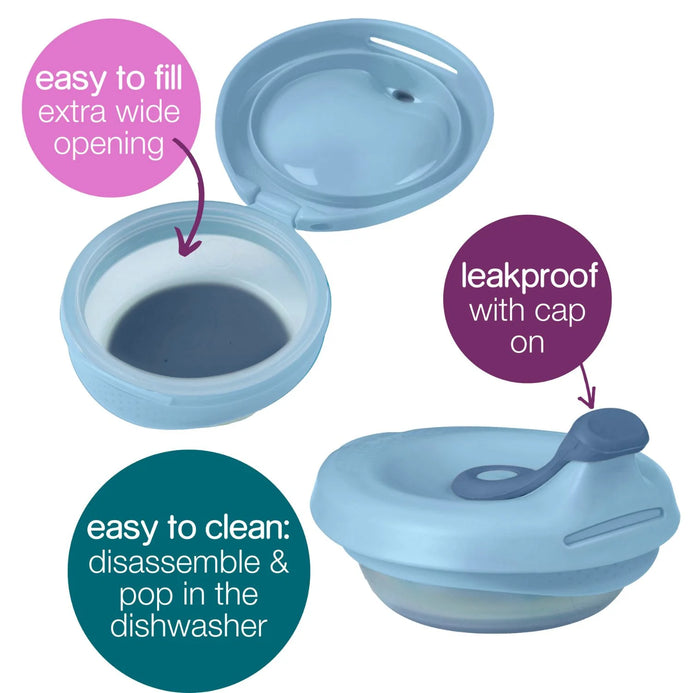 The attached contrasting cap won’t get lost and keeps the spout squeaky clean when out and about. Plus it seals closed and won’t leak in baby bags or prams.