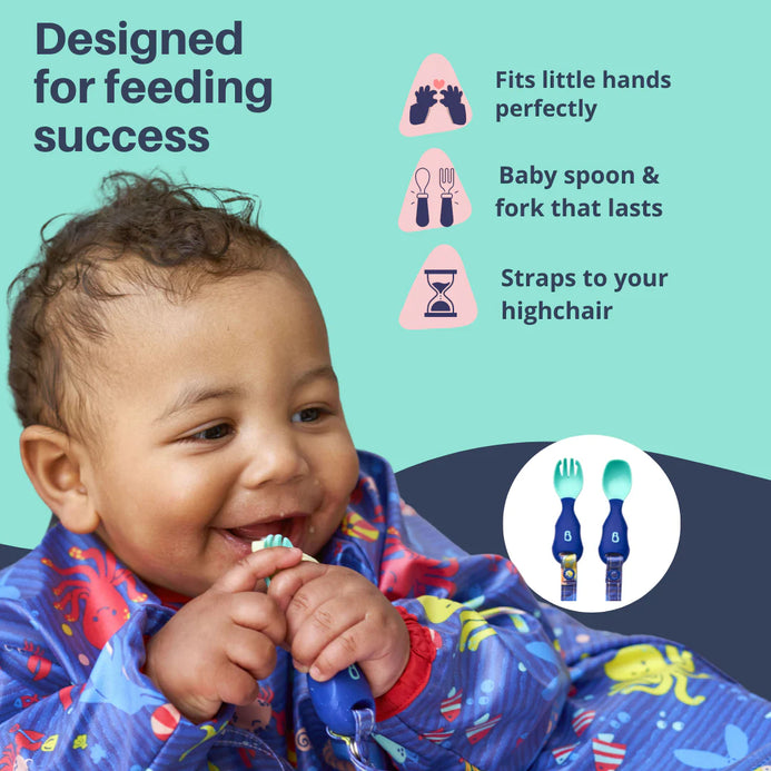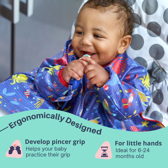 • Designed for little hands - Ergonomically designed to fit your little one's hands to encourage development of their pincer grip. Even when wet, our handy weaning cutlery is still grippy, so less likely to slip out of messy or wet fingers.