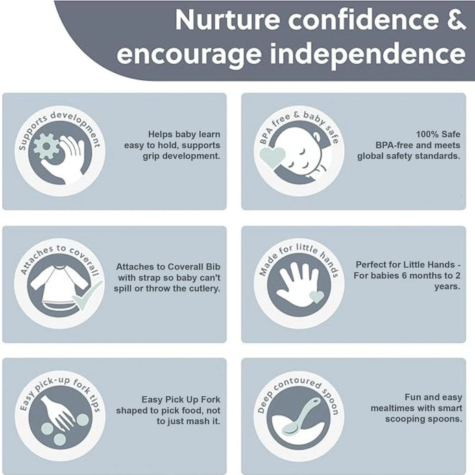 Handi Cutlery is perfect for making mealtime adventures easier and more enjoyable for everyone. It has lots of features to help your little one explore food and learn to use cutlery. It has a unique 'no drop' system by attaching to the Coverall Weaning bib, meaning no more picking up spoons and forks from the floor for you, or frustration for them. This aids your little one's development by allowing them to drop their cutlery as many times as it takes for them to get the hang of it. It's also ergonomically designed for little hands with easy grip handles, and the fork is specially shaped to pick up food rather than mash it.