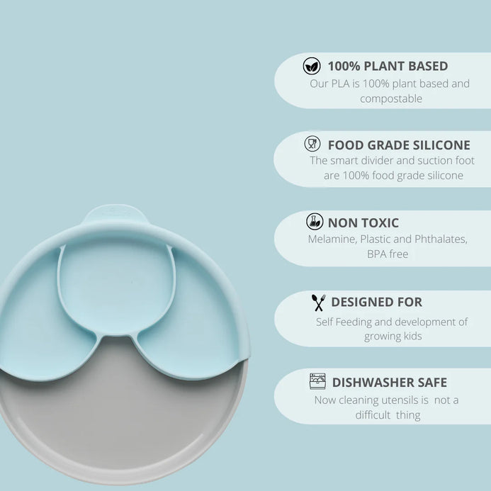 Healthy Meal Set Includes: 1 x Cassava PLA Sandwich Plate, 1 x removable Silicone Divider, 1 x smart detachable Suction Foot with airtight seal, to help keep messy foods in place.