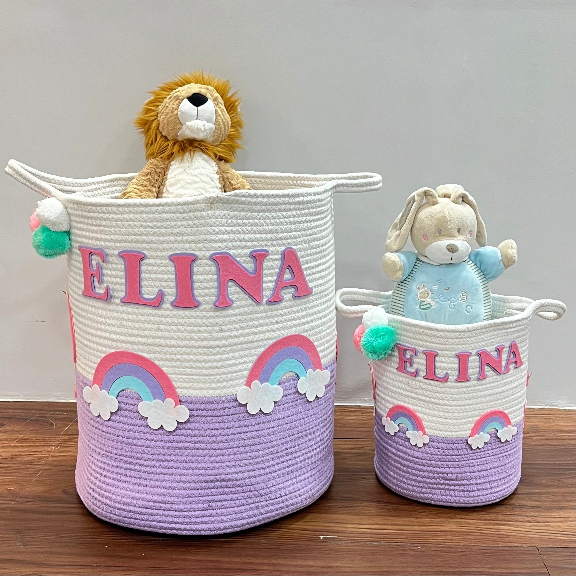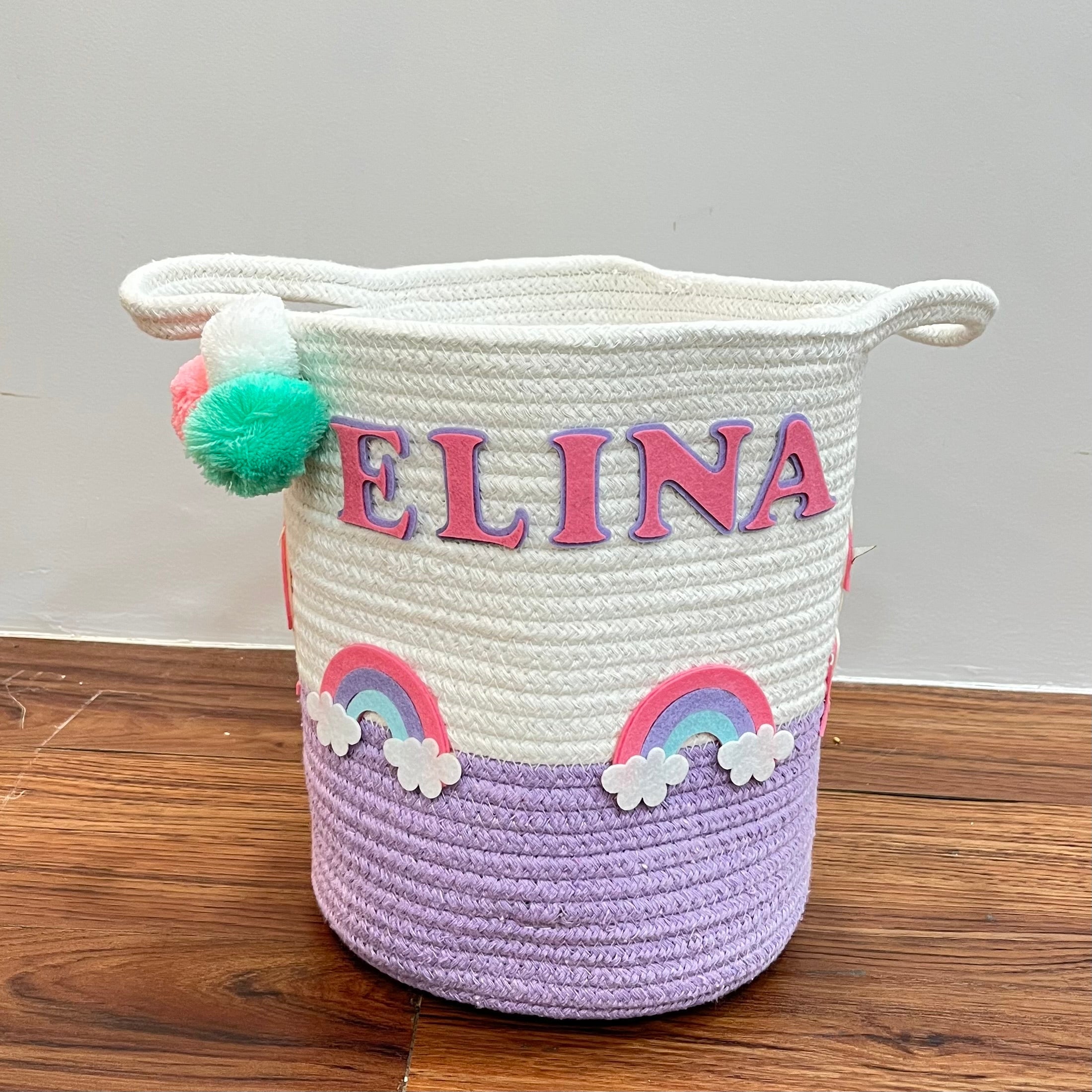 Our Basket crafted from durable jute and soft cotton, it offers both sturdiness and comfort. Perfect for carrying books, toys, or treasures, this basket is as functional as it is enchanting. Elevate your child's storage with a sprinkle of magic and practicality, and let their imagination soar among the stars. This Unicorn Dreams & Rainbows theme basket in bright hues serves as a dual purpose of both kid's room decor as well as storage made easy with two convenient sizes and comes embellished with whimsical Unicorn and Rainbow designs.