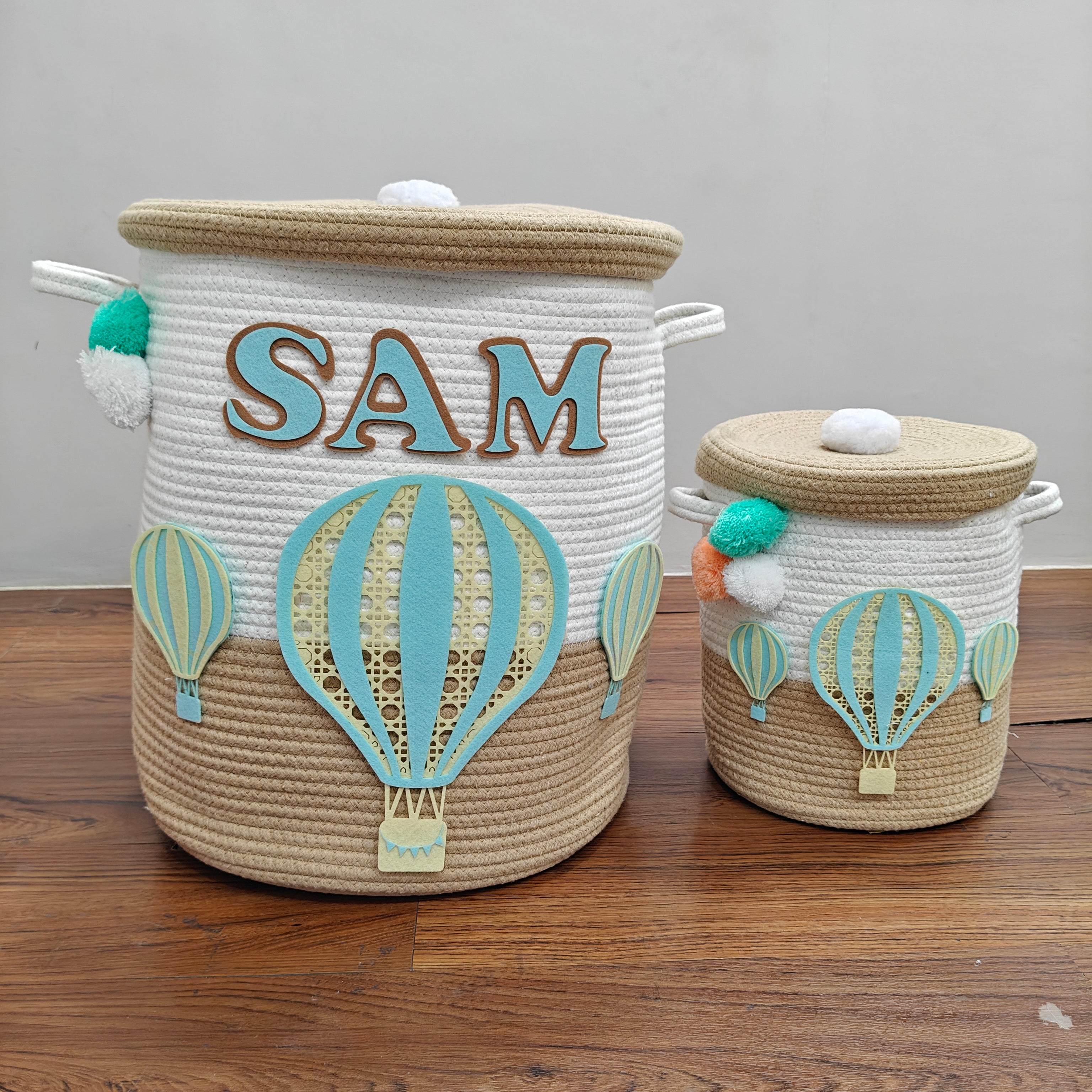 Our Basket crafted from durable jute and soft cotton, it offers both sturdiness and comfort. Perfect for carrying books, toys, or treasures, this basket is as functional as it is enchanting. Elevate your child's storage with a sprinkle of magic and practicality, and let their imagination soar among the stars. This Toffee Drift  theme basket in bright hues serves as a dual purpose of both kid's room decor as well as storage made easy with two convenient sizes and comes embellished with delightful designs of Hot balloon
