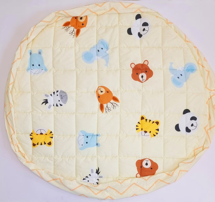 Our storage cum playmat are super stylish, cute, attractive, comfortable and has a multi purpose. Made from 100% Organic Cotton, it can be used to keep your baby on their tummy, it can be used as a playmat and once they are done playing on it, it can be used to store all the toys to avoid a messy nursery. It is as simple as pulling a string to make it a storage bag filled with your babies most favourite toys. It can be used for tummy time as well as to crawl. These adorable prints on the storage bag also enhance the look of your little one's room and create a cozy environment for your baby. They also make a perfect gifting item.