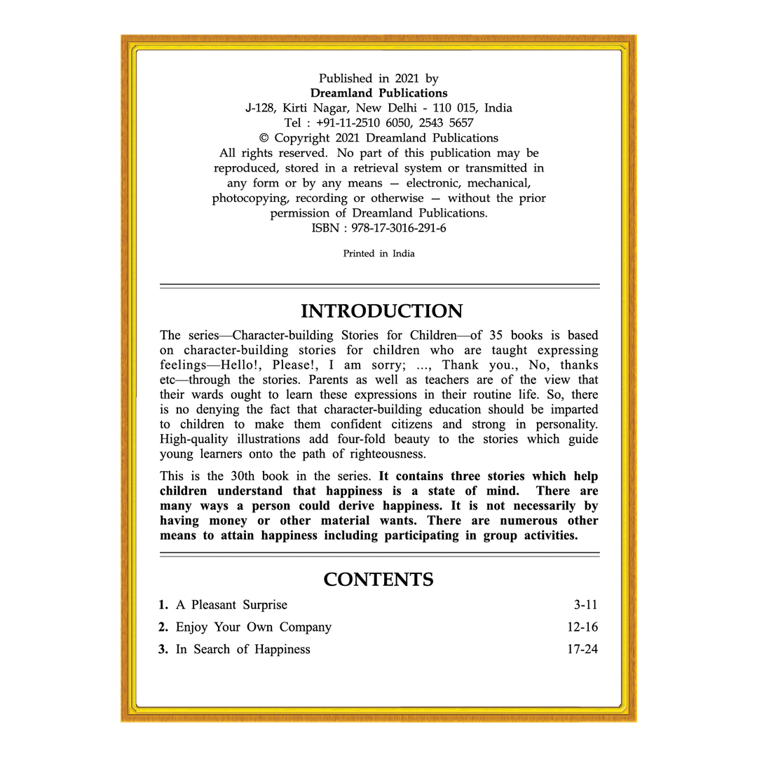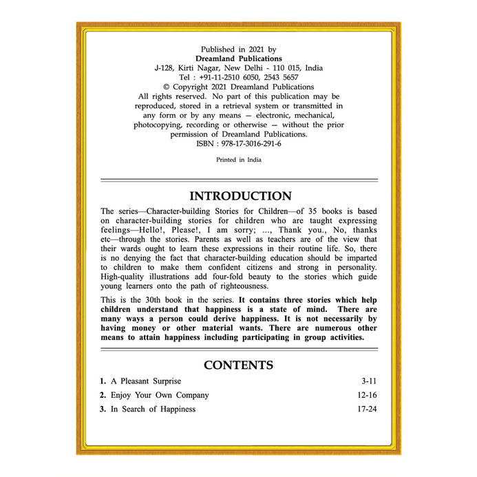 Character education is an integral part of education. ‘Character Building – Happy’ this book contains two stories that teach children that happiness is the key to leading a happy life. Many people associate happiness with money, but true happiness comes when we make others happy. These stories make it easy to teach moral values in a meaningful way. • Ideal for ages 6-8 • 24 pages • Includes moral lessons • Colourful presentation • Nice cover design Designed and compiled keeping young kids in view lessons learnt through these interesting stories will definitely help children become confident citizens. Nice illustrations add beauty to each story that also guides young learners on the path of righteousness. It is an excellent resource for character-conscious kids.