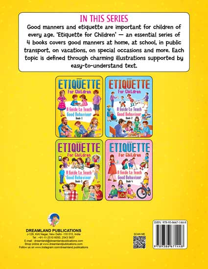 Good manners and etiquette are important for children of every age. Etiquette for children- Book 1 focuses to teach good behaviour to children. Each topic is defined through charming illustrations supported by the easy-to-understand text. • Ideal for age-group 5-12 years • Simple language • Amazing illustrations • Colourful presentation From the magic words to compliments, family time to meeting new people and being courteous, this book will teach kids where, when, and how to use manners as they relate to everyday life. Kids will have fun as they learn to use manners in a way that will make their lives easier and more enjoyable. ?