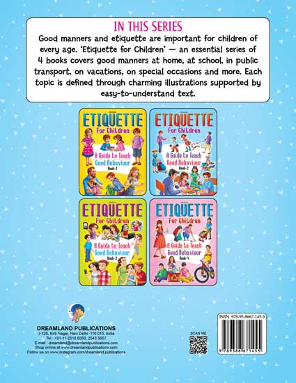 Good manners and etiquette are important for children of every age. Etiquette for children- Book 2 focuses to teach good behaviour to children. Each topic is defined through charming illustrations supported by the easy-to-understand text. • Ideal for age-group 5-12 years • Simple language • Amazing illustrations • Colourful presentation From hotel etiquette to theatre etiquette, shopping manners to restaurant manners, this book will teach kids how to use manners while enjoying leisure time. Kids will have fun as they learn to use manners in a way that will make their lives easier and more enjoyable.