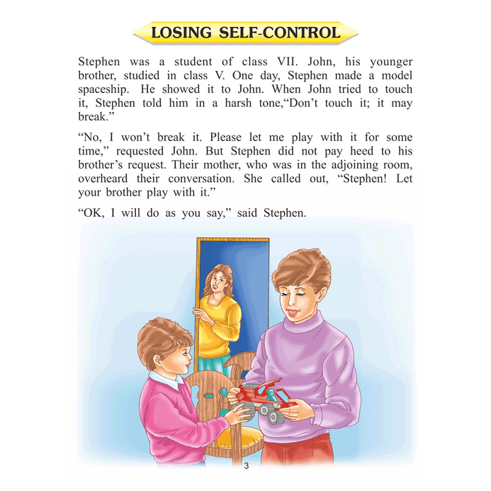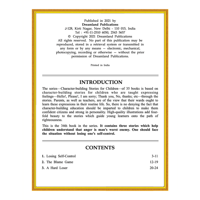 Character education is an integral part of education. ‘Character Building – Angry’ this book contains three stories that make children understand that anger is man’s worst enemy. One should face the situation without losing one’s self-control. These stories make it easy to teach moral values in a meaningful way. • Ideal for ages 6-8 • 24 pages • Includes moral lessons • Colourful presentation • Nice cover design Designed and compiled keeping young kids in view lessons learnt through these interesting stories will definitely help children become confident citizens. Nice illustrations add beauty to each story that also guides young learners on the path of righteousness. It is an excellent resource for character-conscious kids. ?