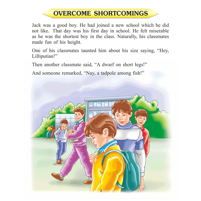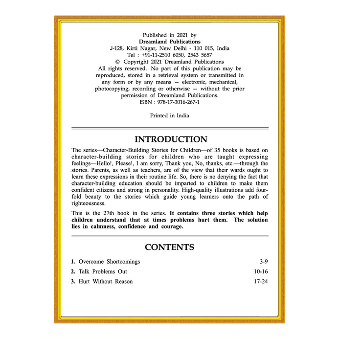 Character education is an integral part of education. ‘Character Building – Hurt’ this book contains three stories that help children understand that at times problems hurt them. The solution lies in calmness, confidence, and courage. These stories make it easy to teach moral values in a meaningful way. • Ideal for ages 6-8 • 24 pages • Includes moral lessons • Colourful presentation • Nice cover design Designed and compiled keeping young kids in view lessons learnt through these interesting stories will definitely help children become confident citizens. Nice illustrations add beauty to each story that also guides young learners on the path of righteousness. It is an excellent resource for character-conscious kids.