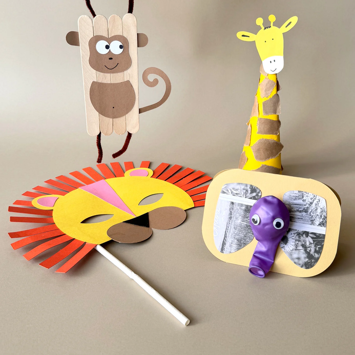 In The Box : 1 lion mask, 1 hanging monkey, 1 elephant card, 1 tall giraffe