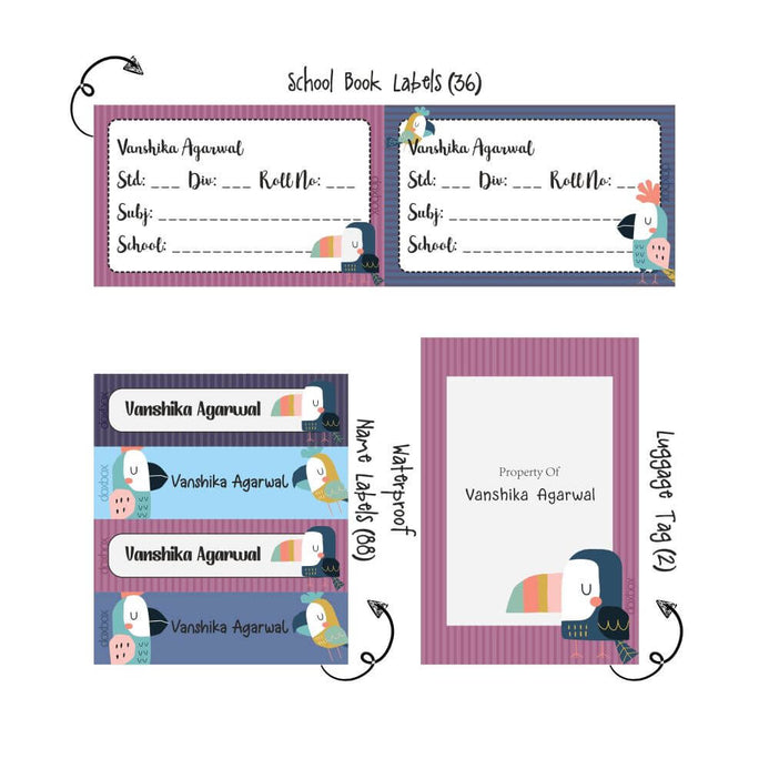 • Product Dimensions: water proof label - 7 cms *2 cms, School Book label - 8 cms * 5 cms, Luggage tag - 6 cms * 9 cms